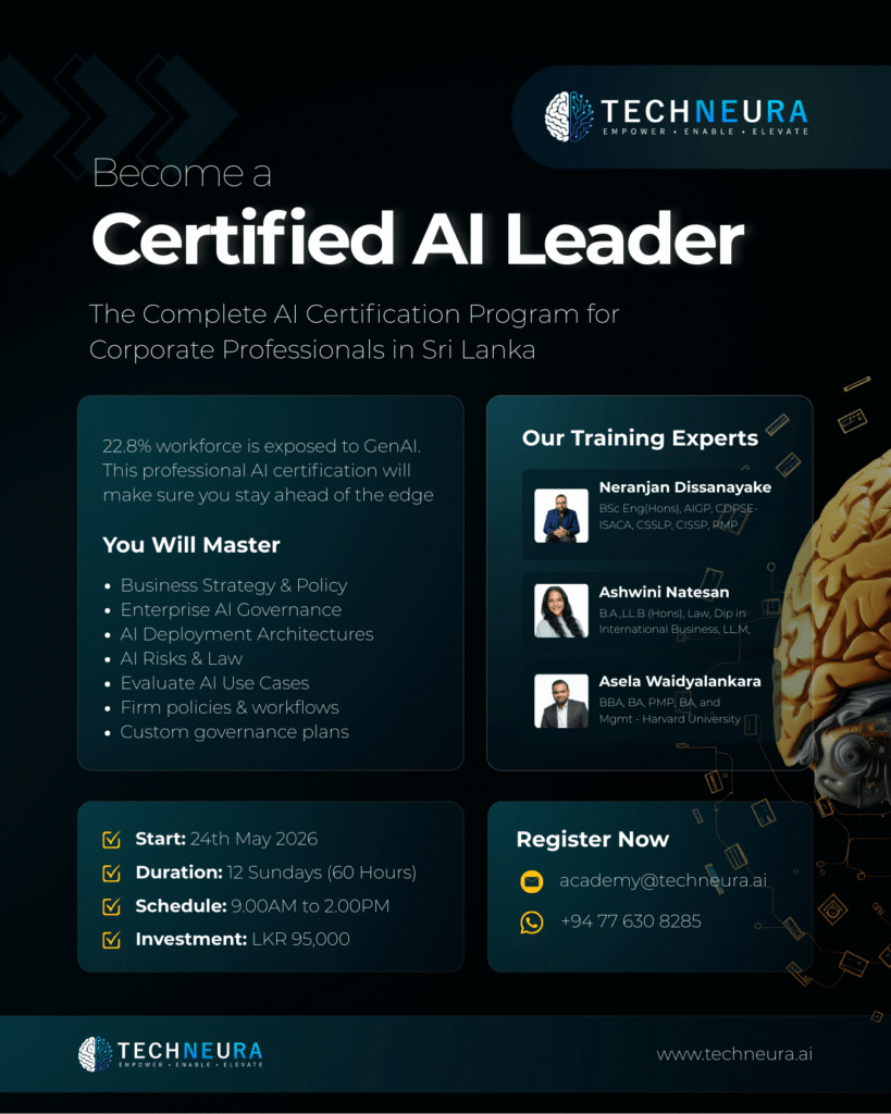 Join the only Professional AI certification designed specifically to bridge Sri Lankan corporate realities with global compliance standards. We do not just talk about AI theory; we give you the tools to govern it, scale it, and secure it.